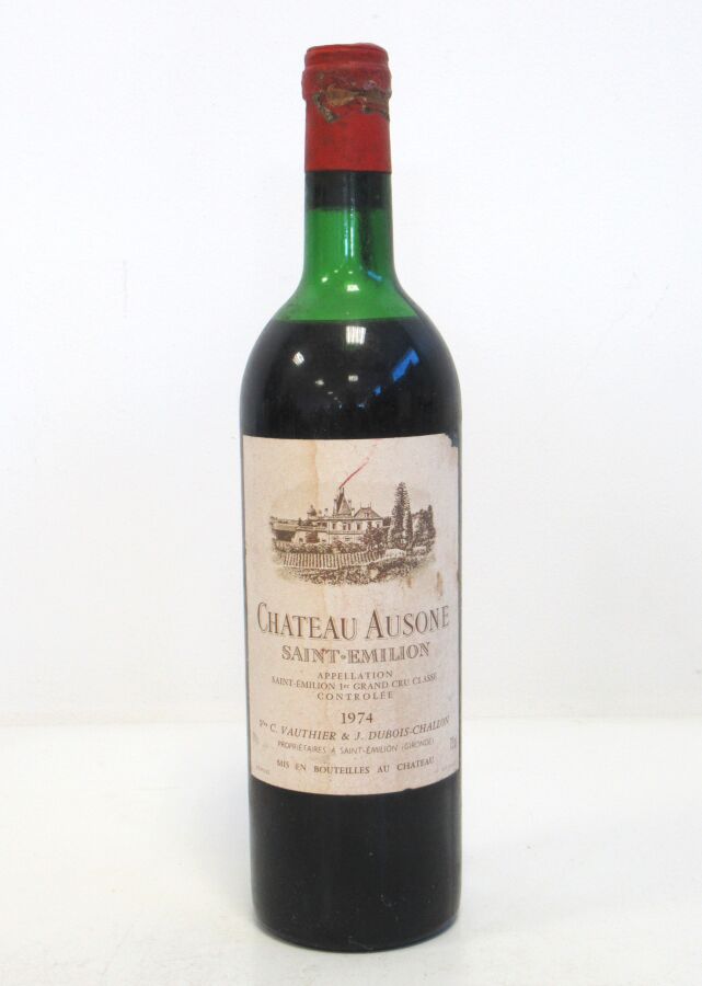 1 Blle CH. AUSONE St Emilion 1er GCC 1974 Et. un peu fanée et tachée (très légèrement effrangée). N : ht/mi épaule.