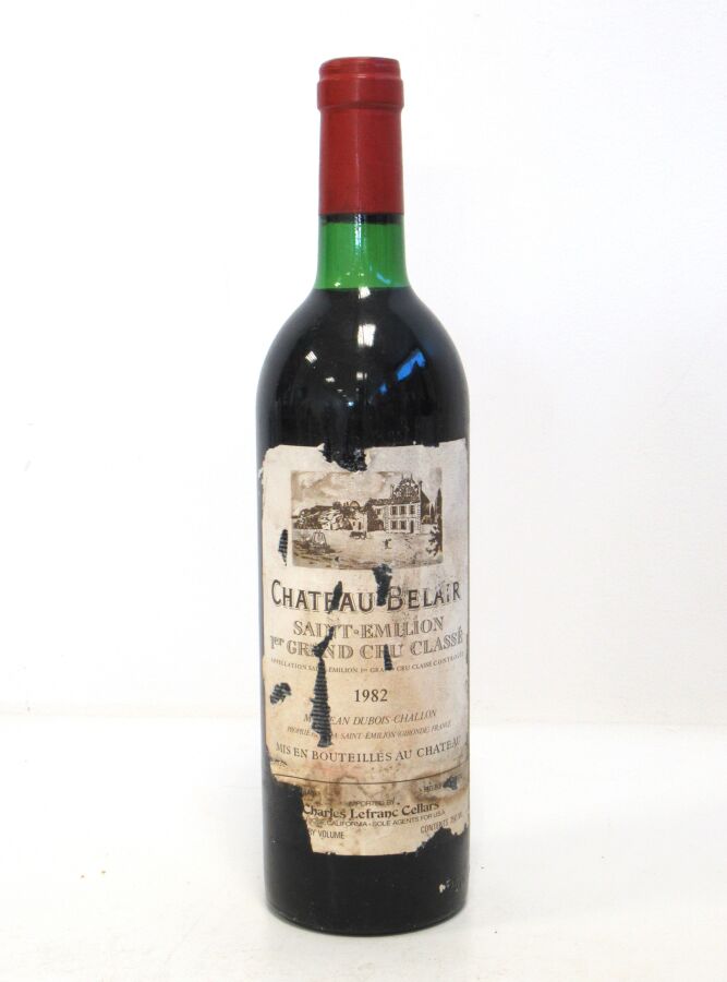 1 Blle CH. BELAIR St Emilion 1er GCC 1982 Et. tachée et déchirée (parfaitement lisible). N : bas goulot/limite haut épaule.
