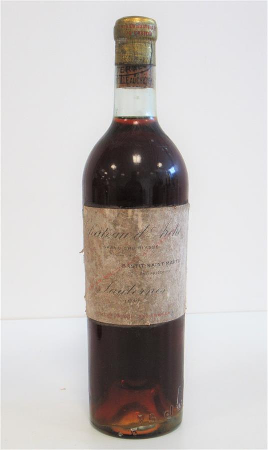 1 Blle CH. D'ARCHE Sauternes GCC 1947 Et. très usée, fanée, tachée et un peu déchirée, mais lisible. N. remarquable : bas goulot.