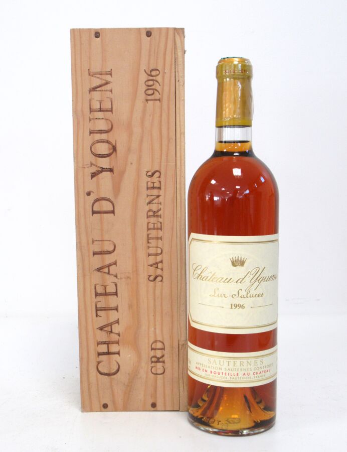 1 Blle CH. D'YQUEM 1er Cru Sup Sauternes 1996 Et. impeccable. N : mi/bas goulot. CBO.