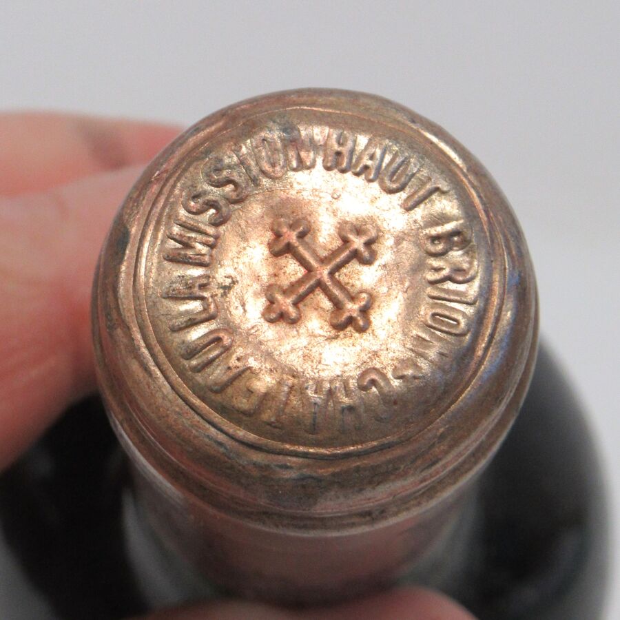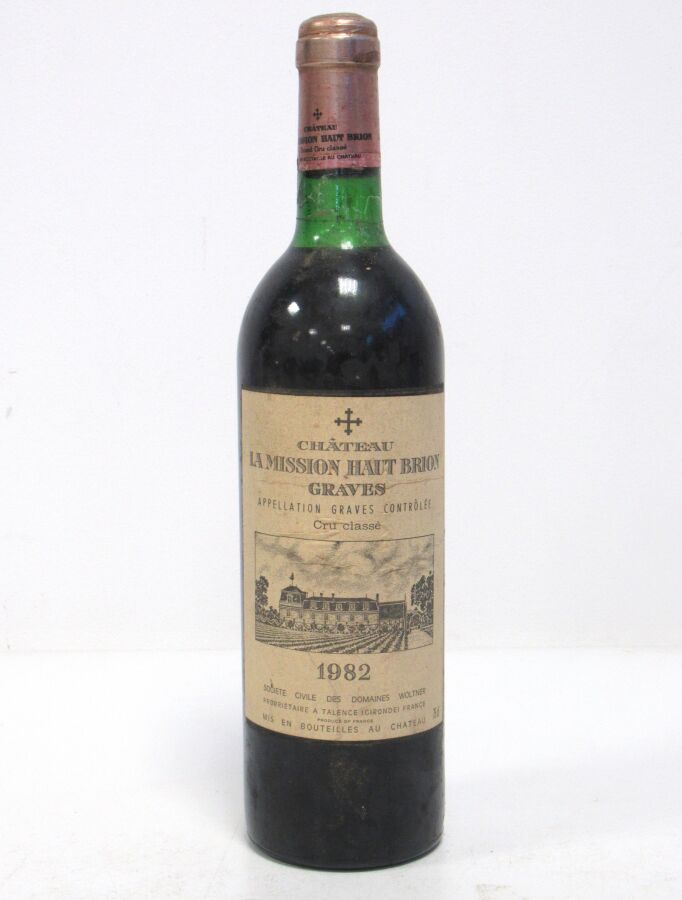 1 Blle CH. LA MISSION HAUT BRION Graves CC 1982 Et. un peu tachée. N : bas goulot/limite haut épaule.