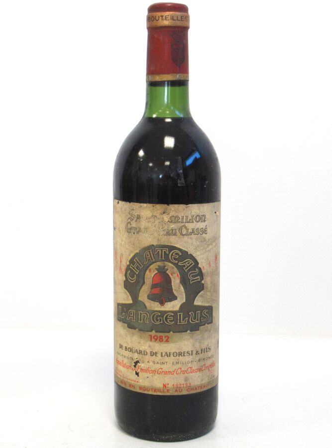 1 Blle CH. L'ANGÉLUS St Emilion GCC 1982 Et. fanée, tachée et usée. N : bas goulot/limite haut épaule.