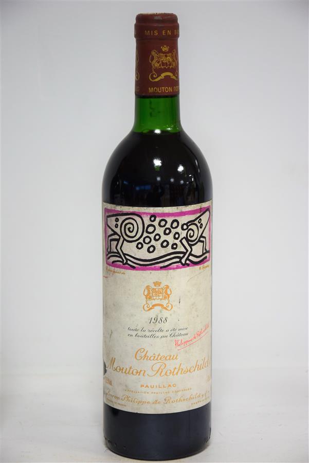 1 Blle CH. MOUTON ROTHSCHILD Pauillac 1er GCC 1988 Et. de Keath Haring, fanée et tachée (1 petite déchirure). N : limite haut épaule.
