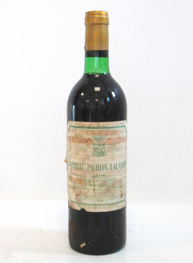 1 Blle CH. PICHON LALANDE Pauillac GCC 1977 Et. fanée, tachée et un peu déchirée. N : bas goulot/limite haut épaule.