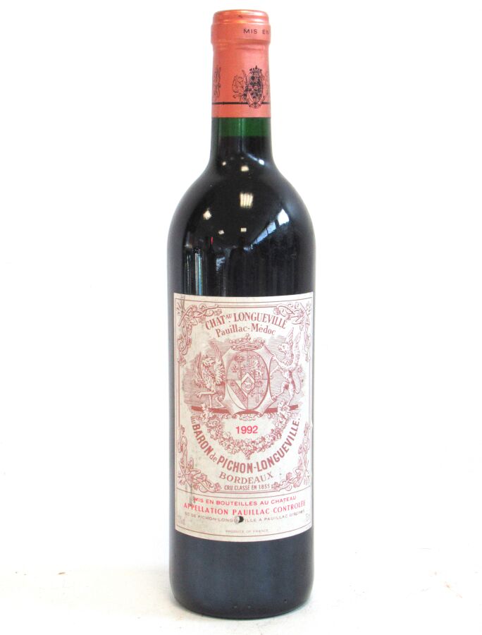 1 Blle CH. PICHON LONGUEVILLE Pauillac GCC 1992 Et. un peu tachée (1 accroc). N : mi goulot.