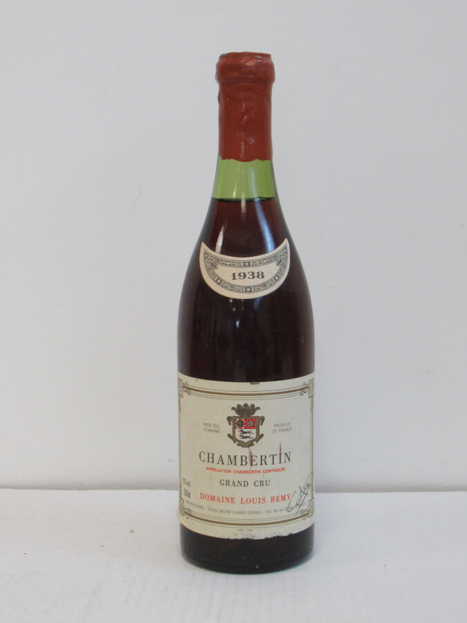 1 Blle CHAMBERTIN GC mise Dom. Louis Rémy 1938 Et. légèrement tachée et usée. Capsule cire un peu abimée. N : 3 cm.