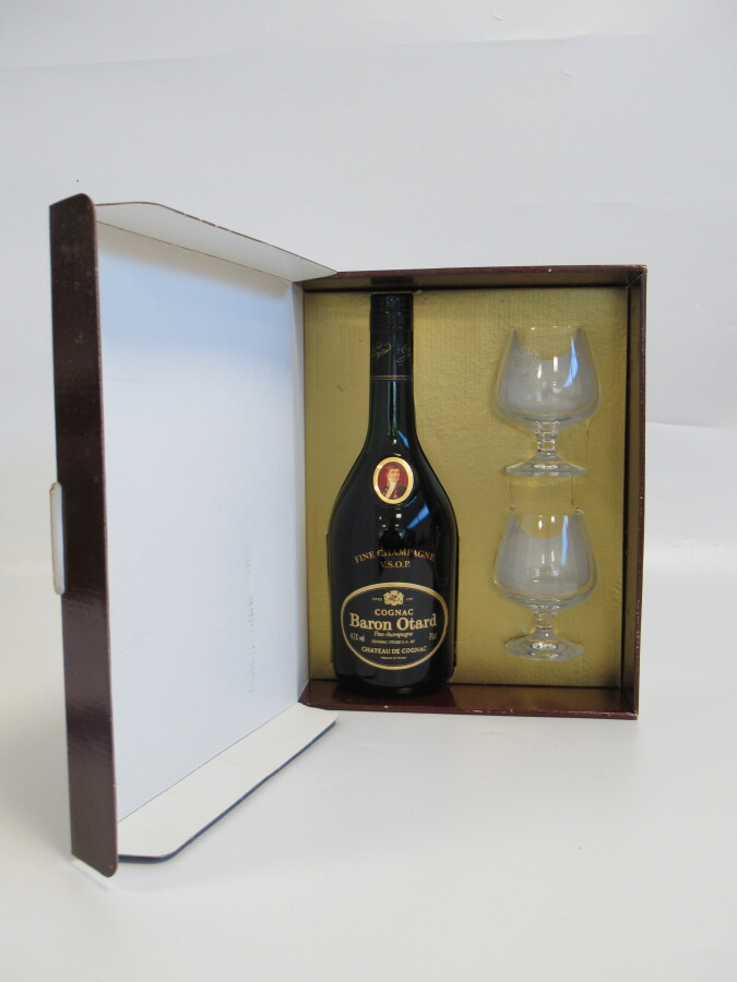 1 Blle Cognac Fine Champagne VSOP mise Baron Otard 70 cl - 40°. Présentation et niveau, impeccables. En coffret d'origine contenant 2 verres à dégustation.