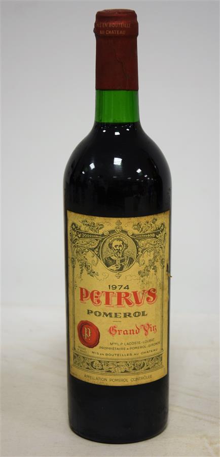 1 Blle PÉTRUS Pomerol 1974 Et. fanée et tachée (1 petite déchirure). N : bas goulot.