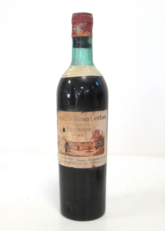 1 Blle VIEUX CHÂTEAU CERTAN Pomerol 1941 Et. fanée, tachée et usée (lisible). N : ht/mi épaule.