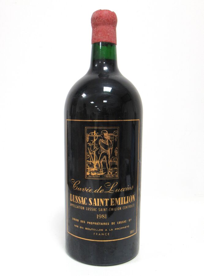 1 Jéro (5L) CUVÉE DE LUCCIUS Lussac St Emilion 1981 mise coop. Et. sérigraphiée impeccable. Capsule cire un peu abimée. N : mi/bas goulot.