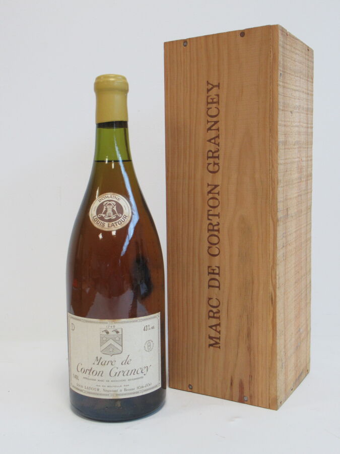 1 Mag (1,4L) MARC de CORTON GRANCEY mise Dom. Louis Latour 43°. Et. un peu tachée. Capsule cire impeccable. N : 3,5 cm. CBO.