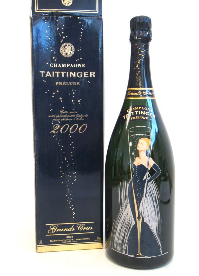 1 Mag Champagne TAITTINGER "Prélude" GC Brut pour célébrer l'an 2000. Belle étiquette sérigraphiée. Coiffe et niveau impeccable. Étui d'origine.