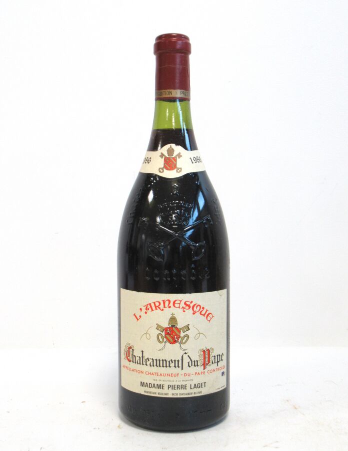 1 Mag CHATEAUNEUF DU PAPE L'Arnesque mise Mme P. Laget 1986 Et. un peu tachée. N : 2,5 cm.