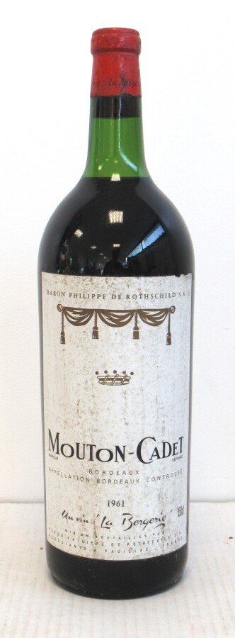 1 Mag MOUTON CADET Bordeaux mise nég. 1961 Et. tachée et légèrement effrangée. N : bas goulot.