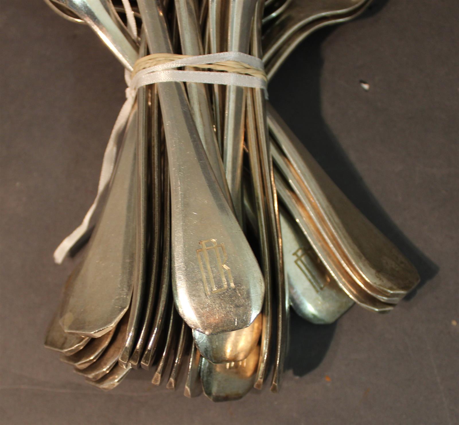 11 Grands couverts et 1 grande fourchette en argent massif, poinçon Minerve, modèle Art-Déco, monogrammé "RD". Poids brut : 2125 g environ