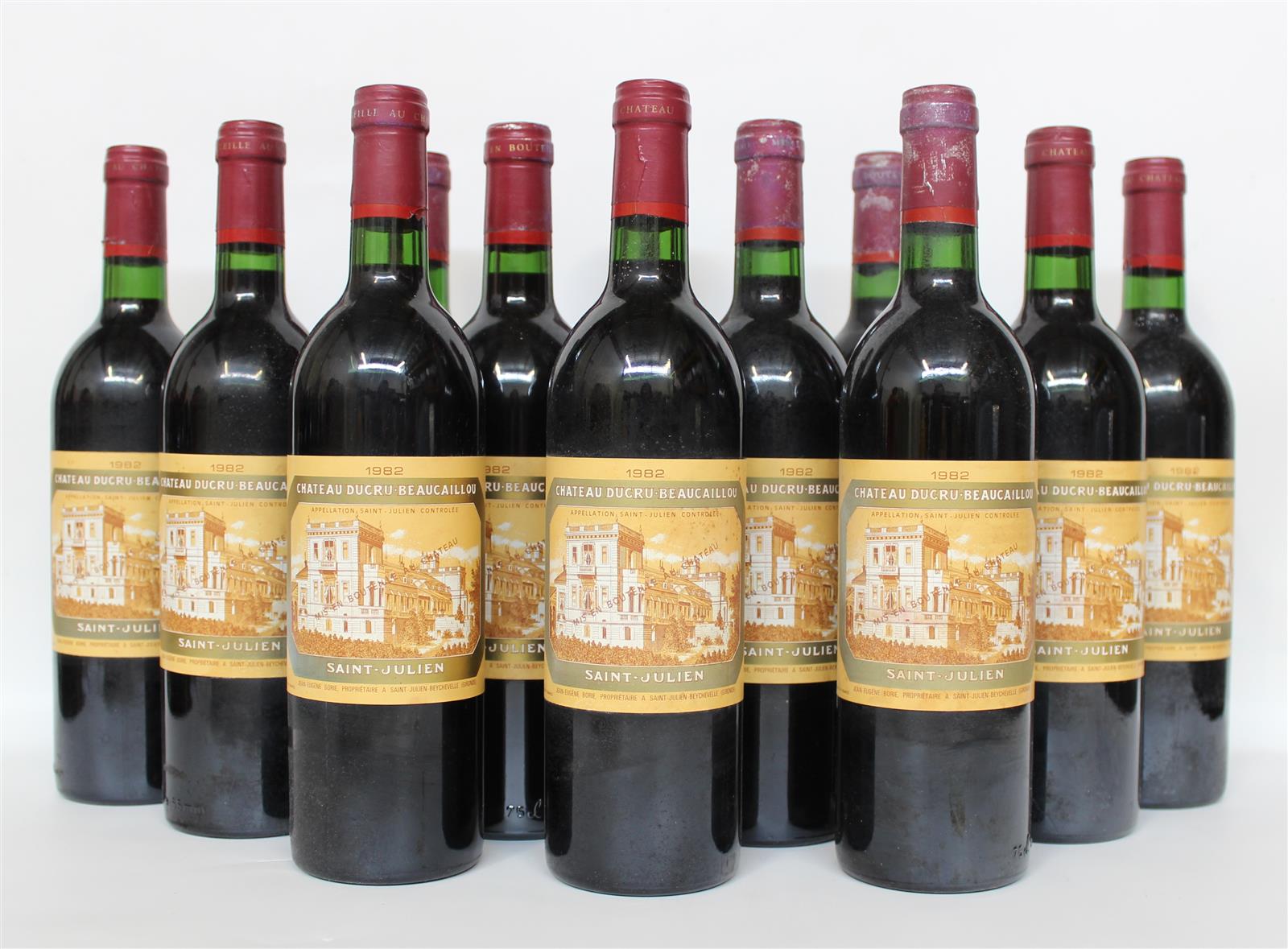 12 Blles CH. DUCRU BEAUCAILLOU St Julien GCC 1982 Et. légèrement tachées. N : 9 mi goulot, 2 mi/bas goulot, 1 bas goulot. CBO