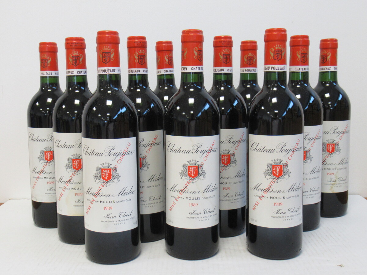 12 Blles CH. POUJEAUX Moulis 1989 Et.: 7 impeccables, 5 un peu tachées. N : 11 mi goulot, 1 mi/bas goulot. CBO.