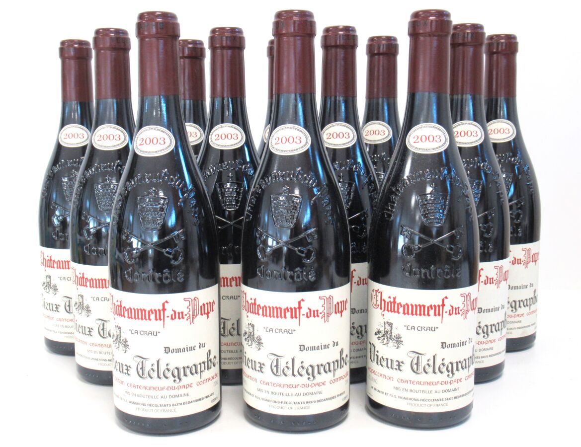 12 Blles CHATEAUNEUF DU PAPE "La Crau" mise Dom. du Vieux Télégraphe 2003 Présentation et niveaux impeccables. CBO.