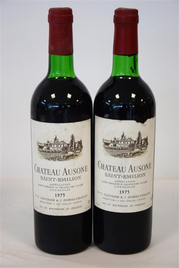 2 Blles CH. AUSONE St Emilion 1er GCC 1975 Et. légèrement tachées (1 un peu déchirée). N : bas goulot/ limite haut épaule.