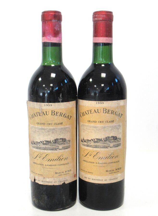 2 Blles CH. BERGAT St Emilion GCC 1959 Et. fanées, tachées (1 usée). N : bas goulot/limite haut épaule.