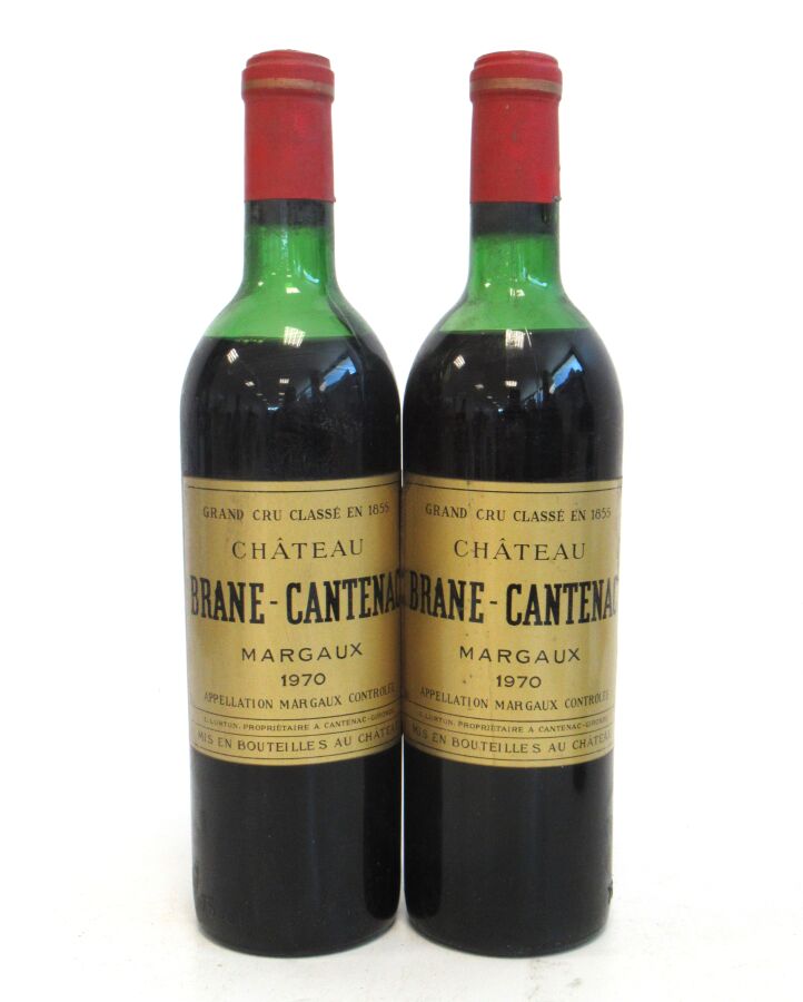 2 Blles CH. BRANE CANTENAC Margaux GCC 1970 Et. un peu tachées. N : 1 ht/mi épaule, 1 mi épaule.