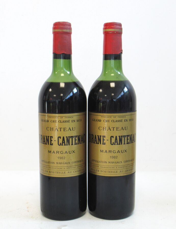 2 Blles CH. BRANE CANTENAC Margaux GCC 1982 Et. à peine tachées. N : ht/mi épaule.