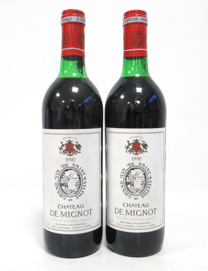2 Blles CH. DE MIGNOT St Estèphe mise nég. 1990 Et. un peu tachées. N : bas goulot/limite haut épaule.
