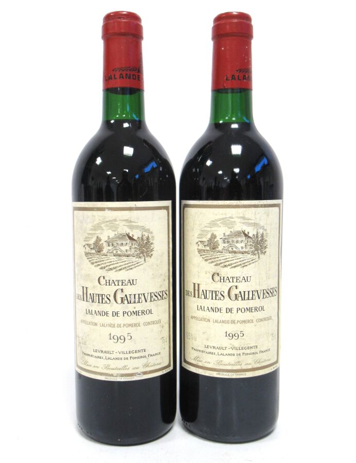 2 Blles CH. DES HAUTES GALLEVESSES Lalande de Pomerol 1995 Et. un peu tachées. N : bas goulot/limite haut épaule.