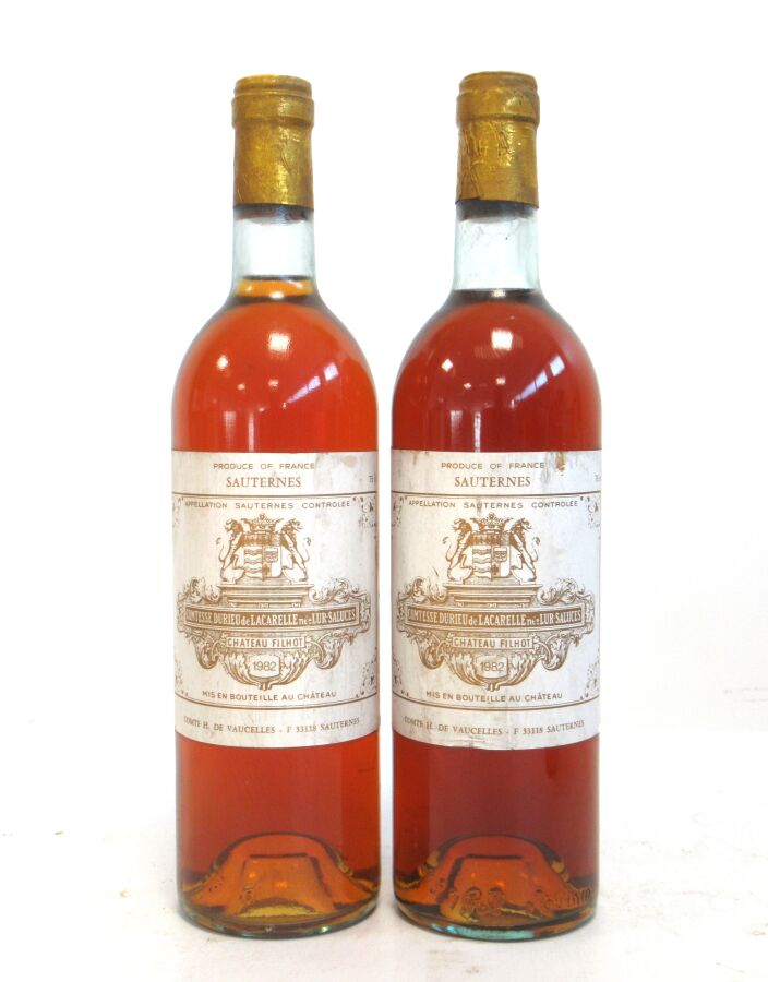 2 Blles CH. FILHOT Sauternes GCC 1982 Et. un peu fanées et tachées. N : 1 bas goulot, 1 bas goulot/limite haut épaule.