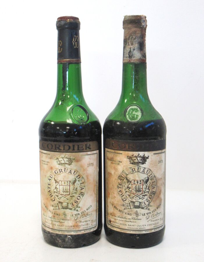 2 Blles CH. GRUAUD LAROSE St Julien GCC 1970 Et. fanées et tachées. Capsules corrodées. N : 7,5 cm.