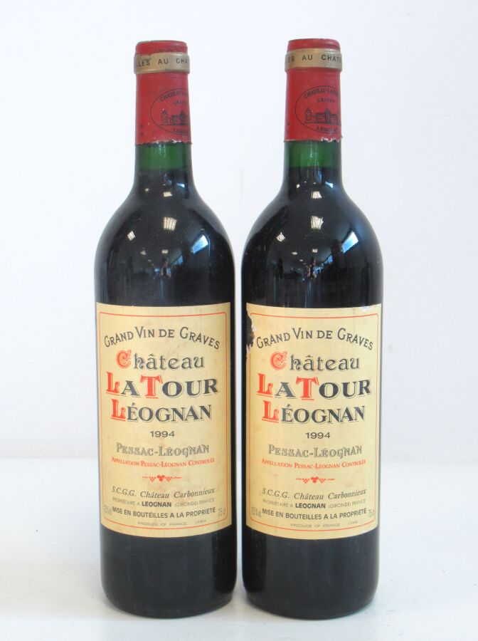 2 Blles CH. LA TOUR LÉOGNAN Graves 1994 Et. légèrement tachées (1 un peu déchirée). N : mi/bas goulot.