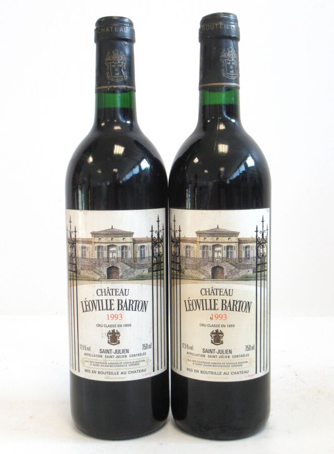 2 Blles CH. LÉOVILLE BARTON St Julien GCC 1993 Et. un peu tachées. N : mi goulot.