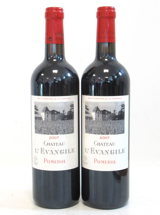 2 Blles CH. L'EVANGILE Pomerol 2007 Et.: 1 impeccable, 1 légèrement tachée. N : mi/bas goulot.