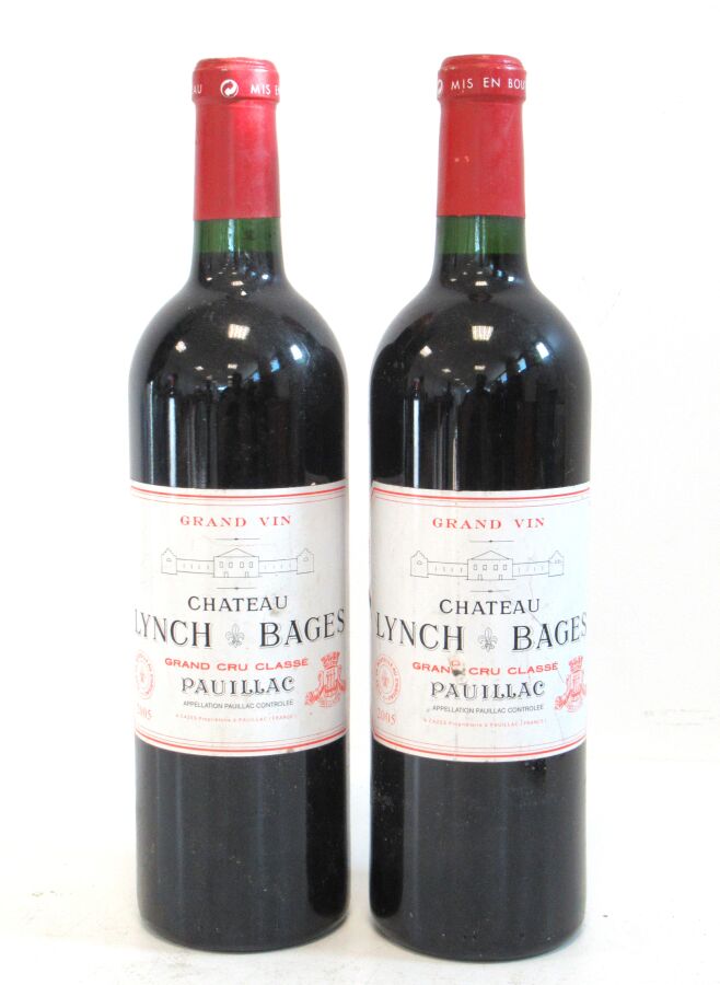 2 Blles CH. LYNCH BAGES Pauillac GCC 2005 Et. légèrement tachées (2 petits accrocs). N : mi/bas goulot.
