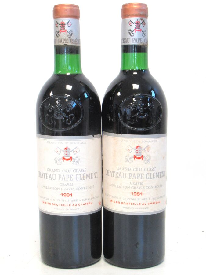 2 Blles CH. PAPE CLÉMENT Graves GCC 1981 Et.: 1 légèrement tachée, 1 un peu plus tachée. N : 1 bas goulot/limite haut épaule, 1 limite haut épaule.