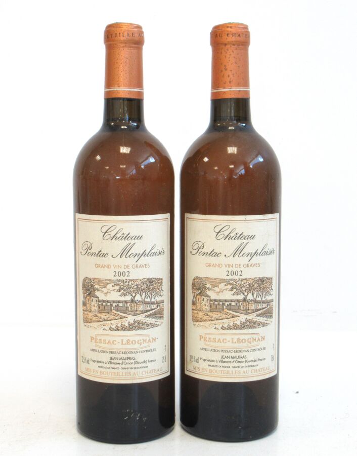 2 Blles CH. PONTAC MONPLAISIR Graves blanc 2002 Et. un peu tachées. N : bas goulot.