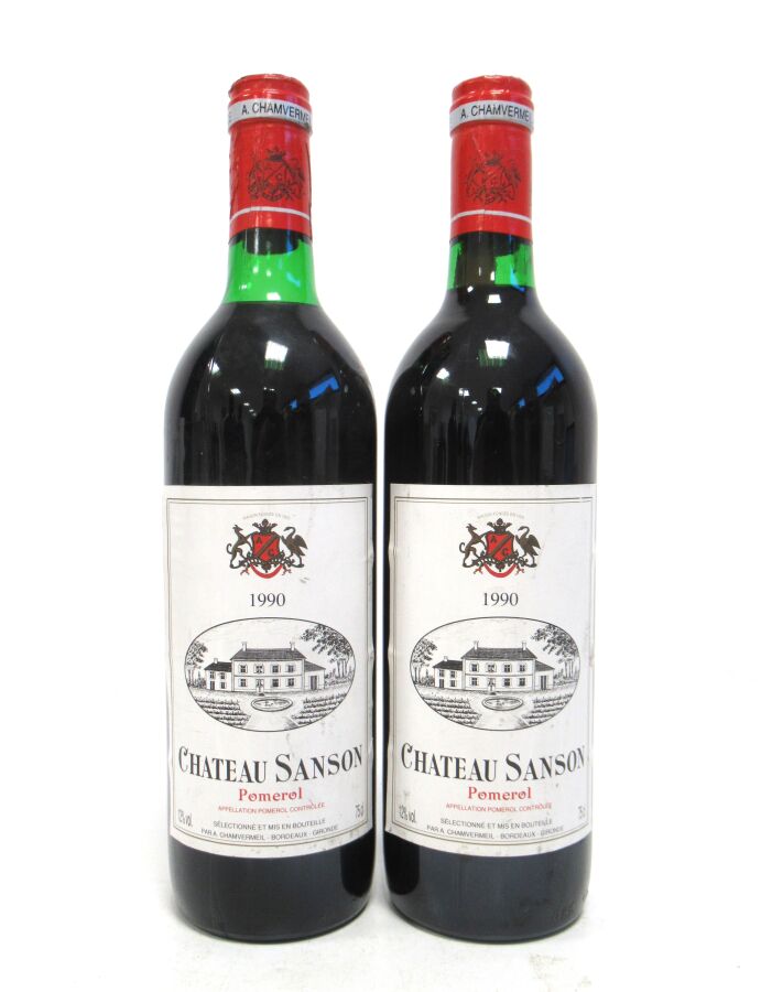 2 Blles CH. SANSON Pomerol mise nég. 1990 Et. un peu tachées. N : 1 bas goulot, 1 limite haut épaule.