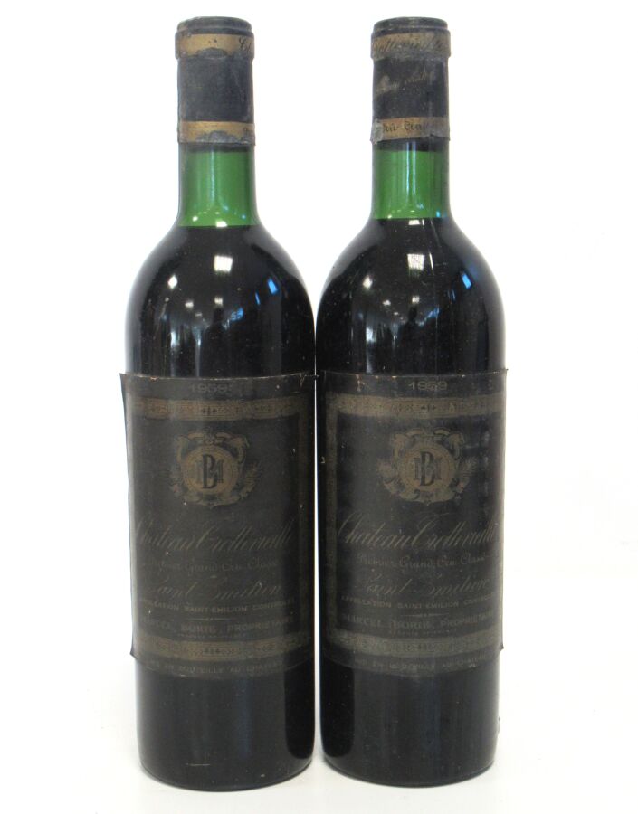 2 Blles CH. TROTTEVIEILLE St Emilion 1er GCC 1959 Et. très fanées, mais lisibles (1 très légèrement déchirée). N : limite haut épaule.