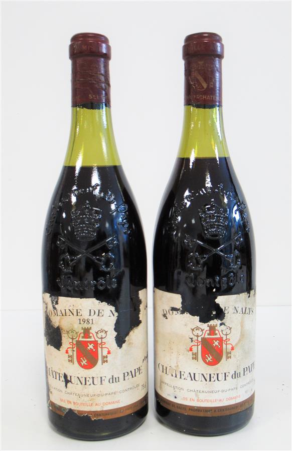 2 Blles CHÂTEAUNEUF DU PAPE mise Domaine Nalys 1981 Et. tachées et déchirées (1 supposée 1981). N : 4 cm.