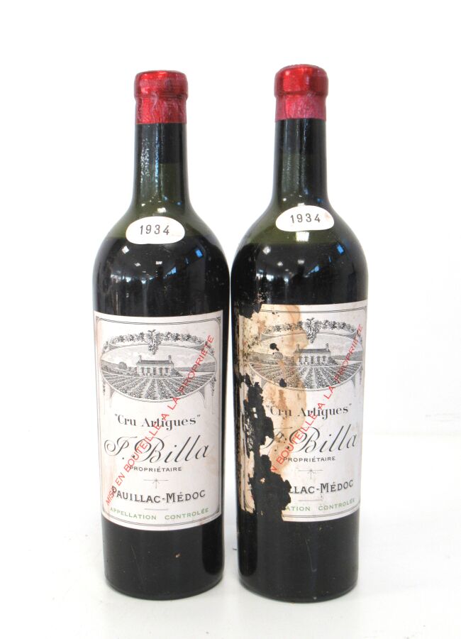 2 Blles "CRU ARTIGUES" Pauillac 1934 Et.: 1 un peu tachée, 1 tachée et très usée. N : ht/mi épaule (-), 1 mi épaule.
