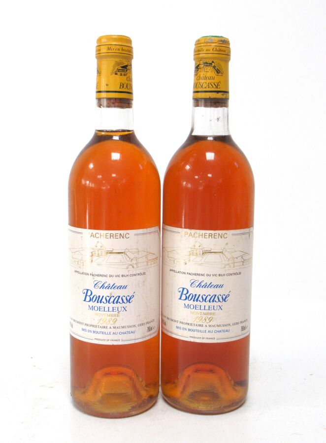 2 Blles PACHERENC DU VIC BILH mise Château Bouscassé (Novembre) 1989 Et. un peu tachées. N : 1 bas goulot/limite haut épaule, 1 limite haut épaule.