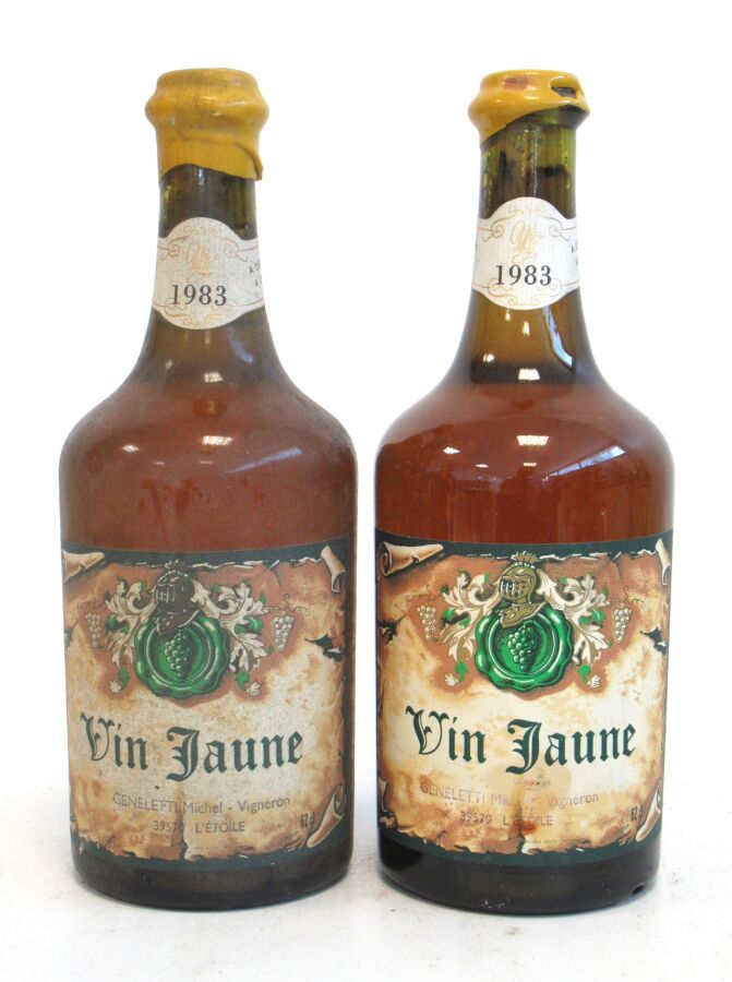 2 Blles VIN JAUNE mise Geneletti Vigneron 1983 Et. tachées. N : 2 cm.
