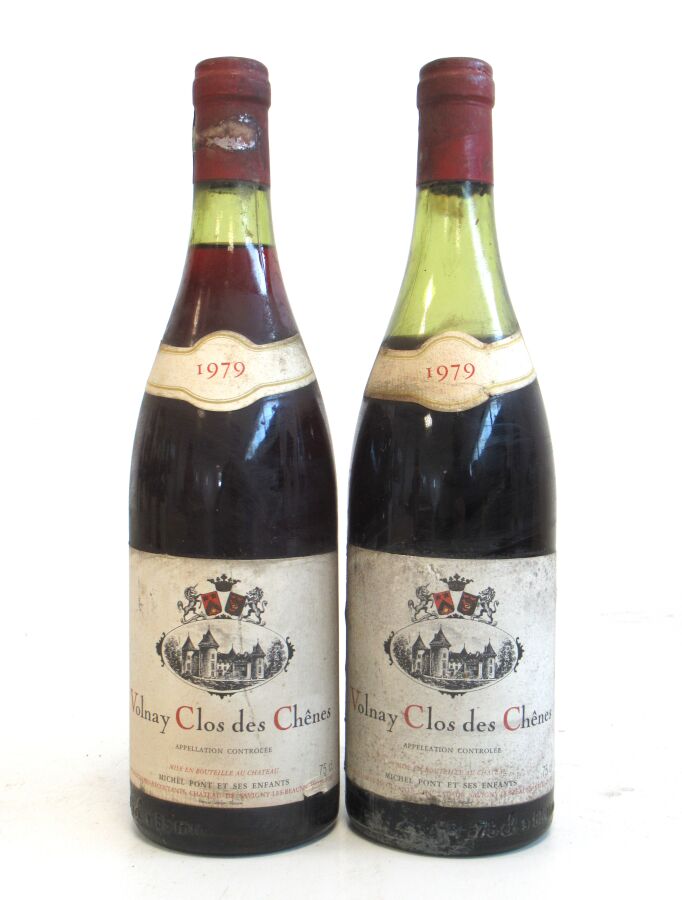 2 Blles VOLNAY Clos des Chênes mise Michel Pont Prop. 1979 Et. tachées. N : 1 x 2 cm, 1 x 6 cm.