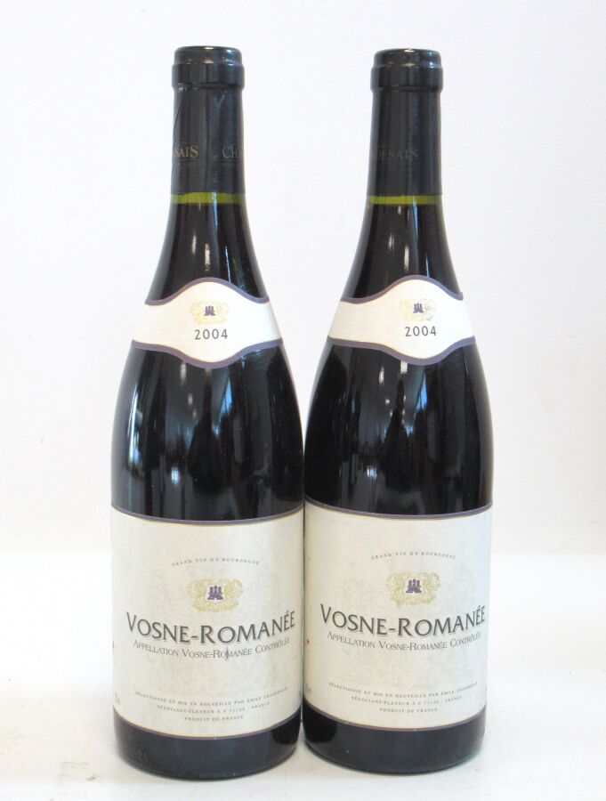 2 Blles VOSNE ROMANÉE mise E. Chandesais nég. 2004 Et. à peine tachées. N : 0,5 cm.
