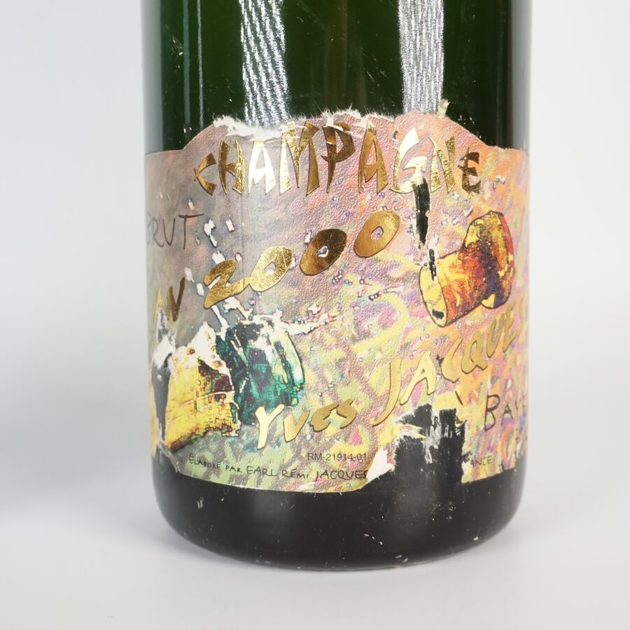 2 Btls de Champagne YVES JACQUES - l'une Brut, Cuvée du Bicentenaire de la Révolution Française, la seconde Brut, de l'An 2000 (usures et déchirures aux étiquettes).