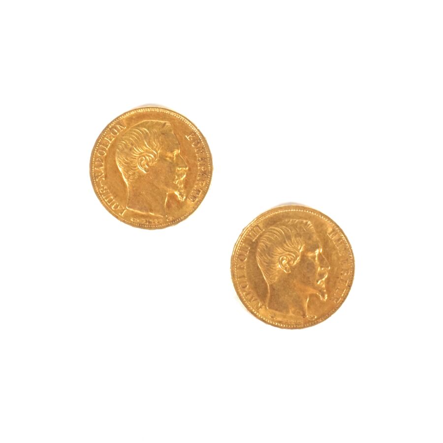 2 x 20 Francs or, Napoléon III "Tête nue", 1 x 1852 A et 1 x 1859 A, Poids brut : 12.9 g environ.