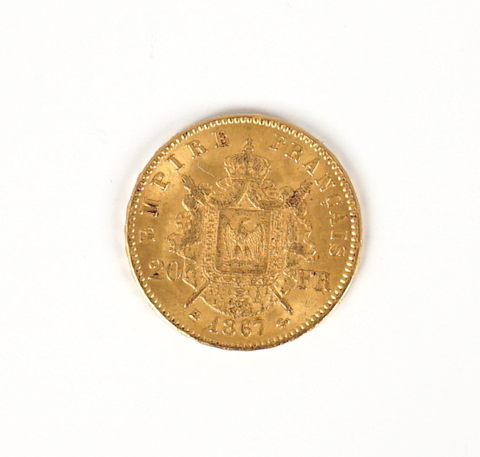 20 Fr Napoléon III Empereur 1867 "tête laurée". Poids brut : 6.4 g environ.