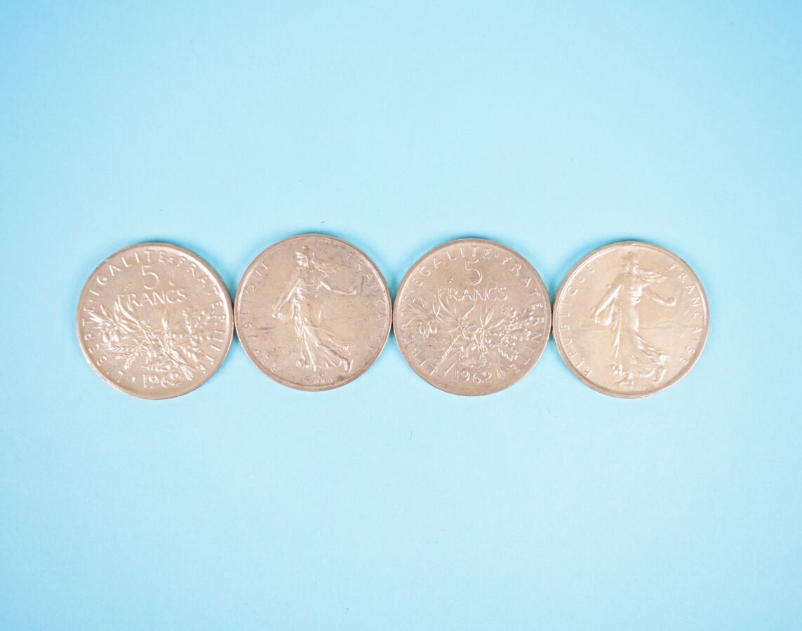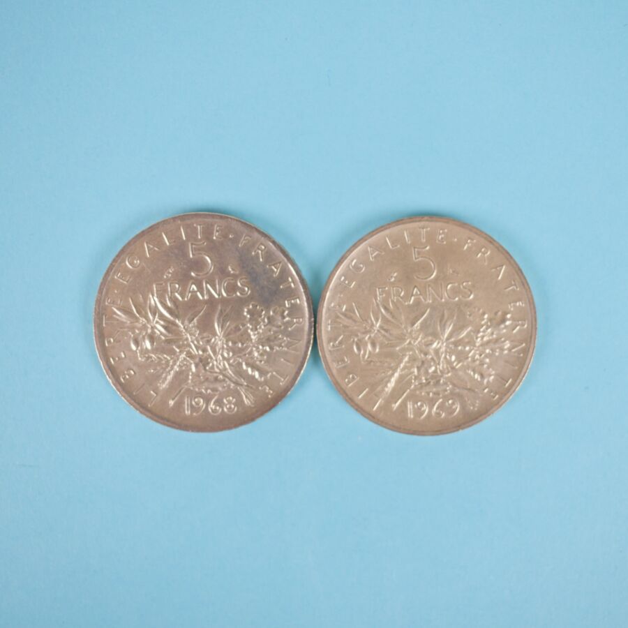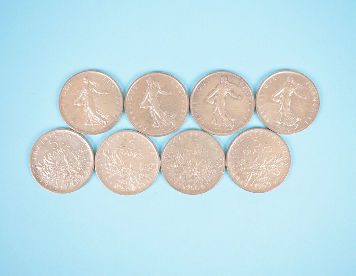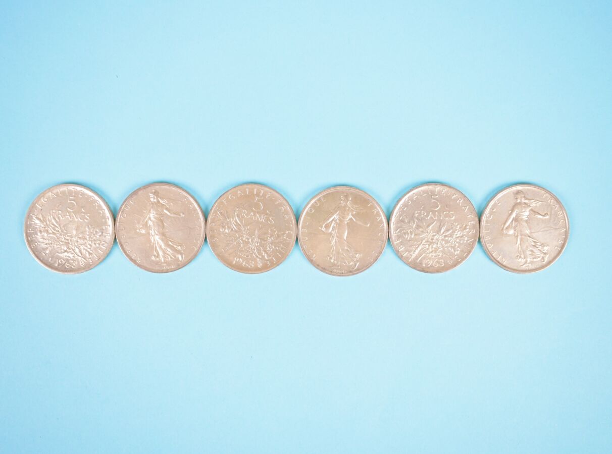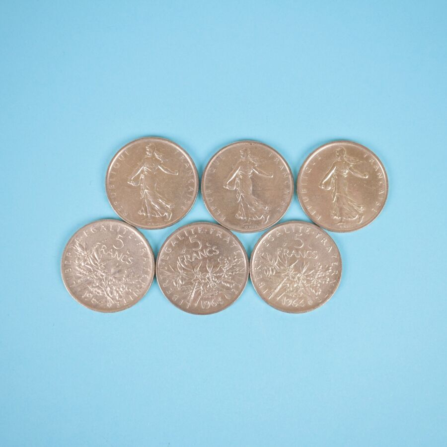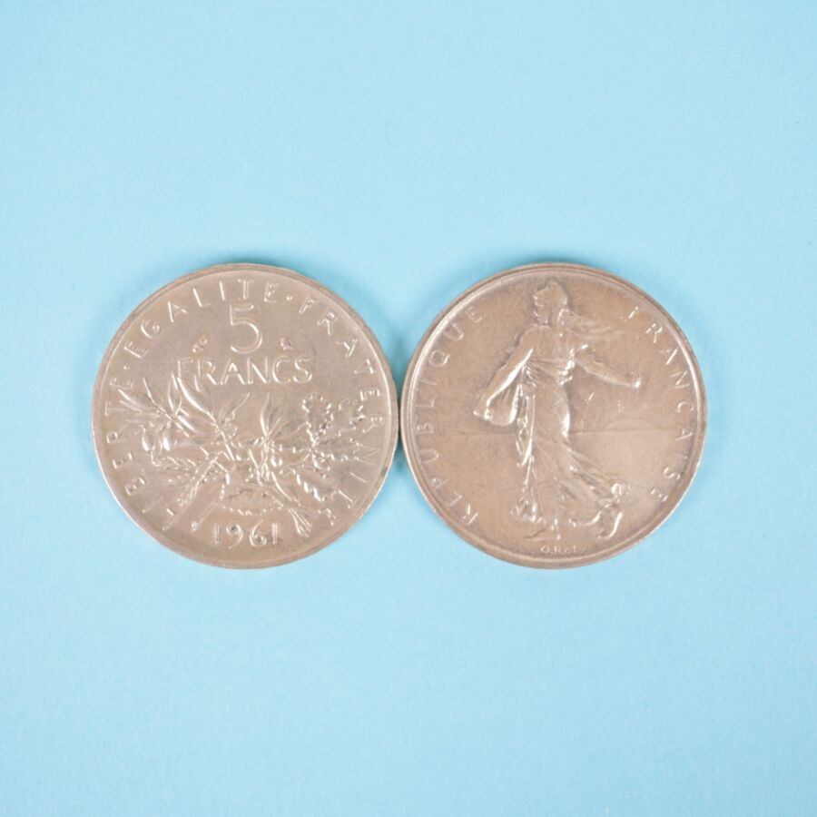 28 x 5 Francs Hercule, argent : dont 8 x 1960 ; 4 x 1962 ; 2 x 1961 ; 6 x 1963 ; 6 x 1964 ; 1 x 1968 ; 1 x 1969. Poids brut : 340 g environ.