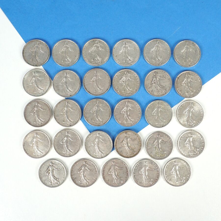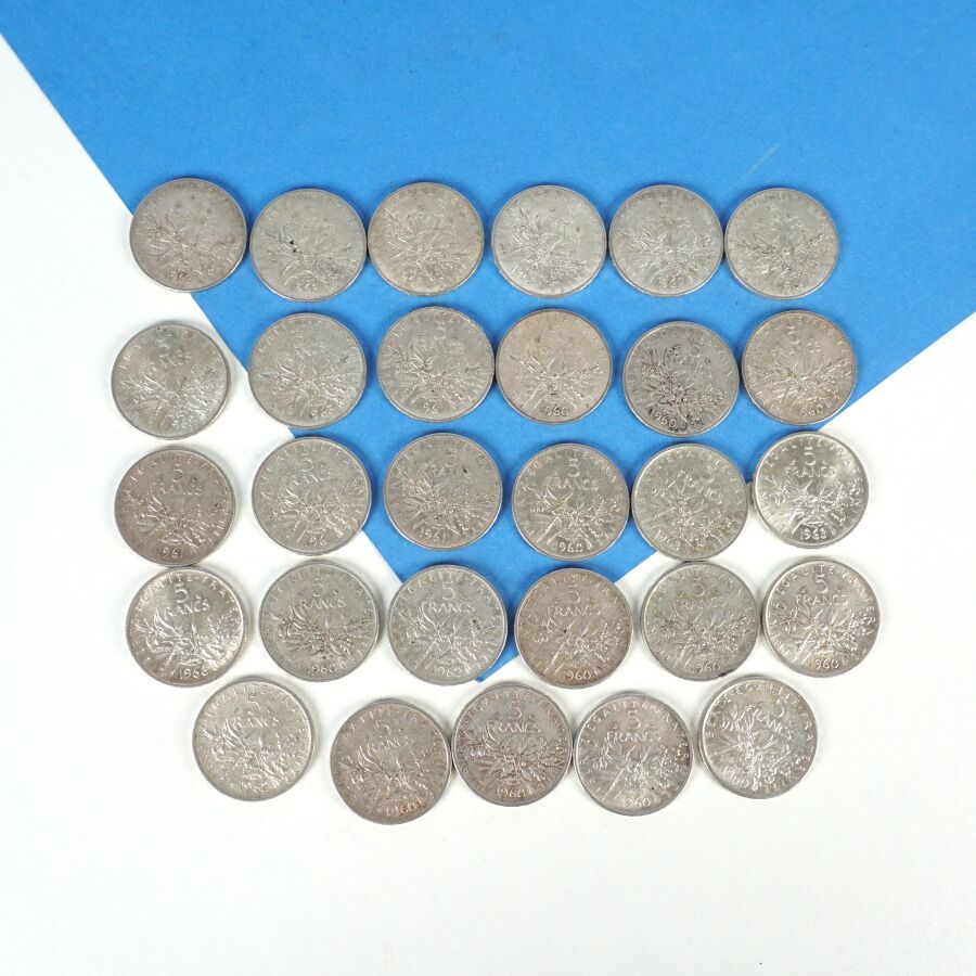 29 x 5 francs type semeuse, argent 12 x 1960, 4 x 1961, 4 x 1962, 7 x 1963, 1 x 1964 et 1 x 1966, Poids brut : 348 g environ.