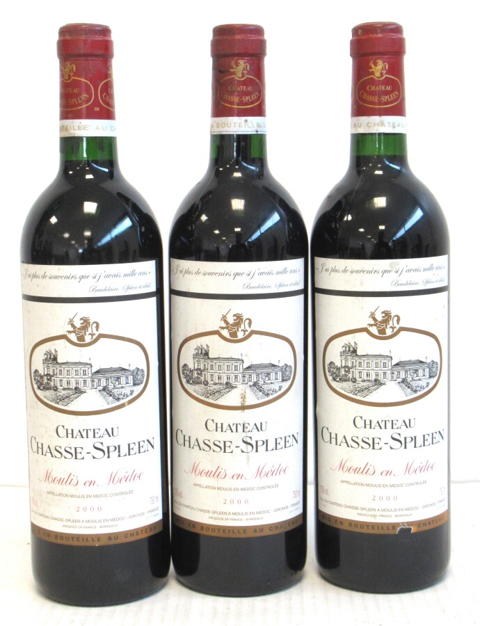 3 Blles CH. CHASSE SPLEEN Moulis 2000 Et. un peu tachées (1 déchirure). N : mi/bas goulot.